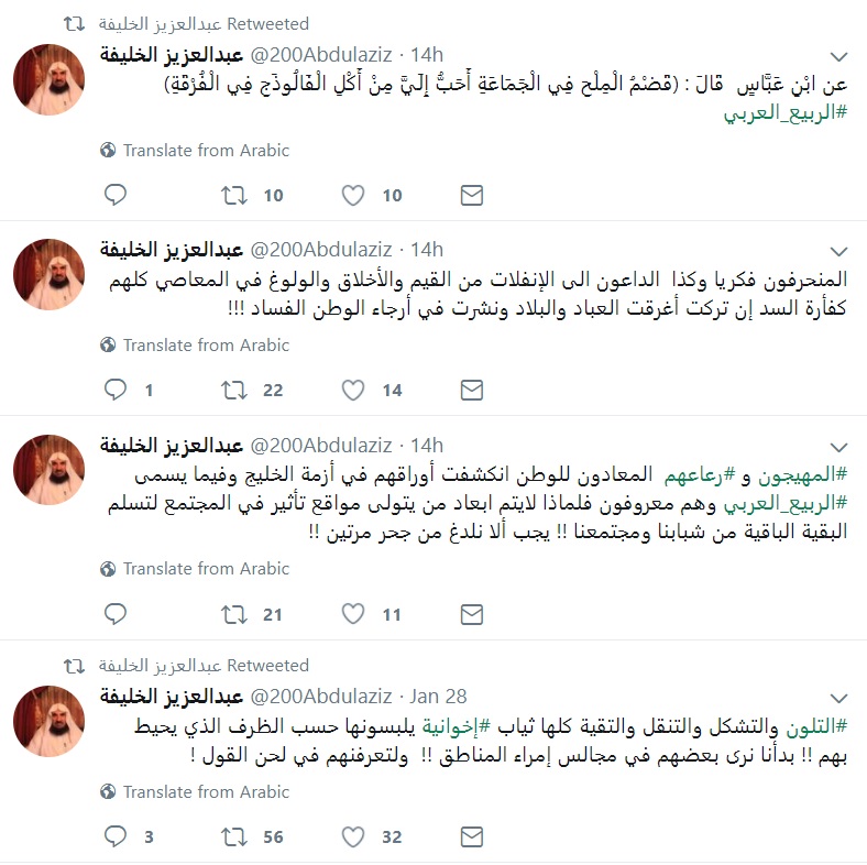 وقال "الخليفة" في سلسلة من التغريدات على تويتر: "التلون والتشكل والتنقل والتقية كلها ثياب إخوانية يلبسونها حسب الظروف التي تحيط بهم، بدأنا نرى بعضهم في مجالس إمراء المناطق!، ولتعرفنهم في لحن القول!".