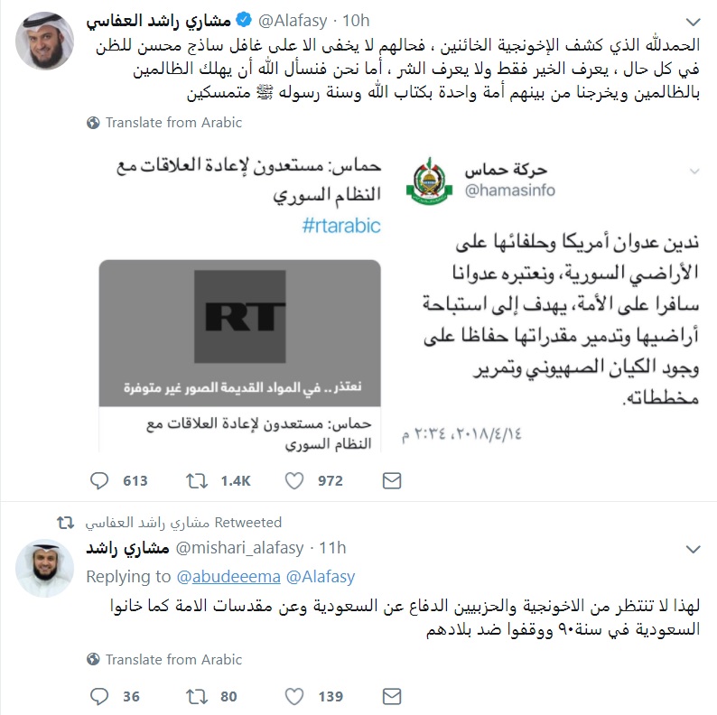 شن الشيخ مشاري راشد العفاسي، القارئ والمنشد الكويتي، هجومًا عنيفًا ضد حركة "حماس" الإخوانية؛ وذلك عقب إدانتها الضربة التي وجهتها أمريكا وبريطانيا وفرنسا لمواقع النظام السوري، إثر اتهامه بشن هجوم كيماوي في دوما.
